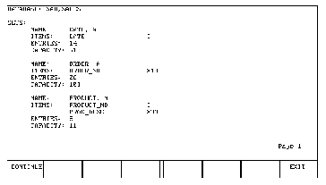 This first line displays the name of the database and the volume on which it is located. The next set of lines gives you the name and type of each data set. The item names, the number of entries currently in the data set and the maximum capacity of the data set are listed. The third set of lines lists the data paths between data sets. In the database SAD, six data paths exist.